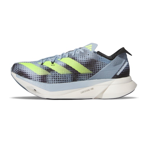 Die adidas Adizero Adios Pro 3 sind neutrale Wettkampfschuhe. Dieses Modell von adidas ist darauf ausgelegt, sowohl beim 10-km-Lauf als auch beim Marathon eine persönliche Bestleistung zu erzielen. Die schnellen Wettkampfschuhe verfügen über Carbon und den reaktionsfreudigen LightstrikePro-Schaum in der Zwischensohle. Welche Updates gibt es im Vergleich zum Adios Pro 2? Erstens gibt es dank nicht weniger als zwei Schichten LightstrikePRO-Schaum mehr Polsterung unter dem Fuß. Dies sorgt für maximale Dämpfung und Energierückgabe. Darüber hinaus wurden in der Sohle am Vorfuß, Mittelfuß und an der Ferse sogenannte „Cutouts“ (Einkerbungen) angebracht. Dadurch ist das Adios Pro 3 etwas leichter als sein Vorgänger. Und schließlich wurde das Obermaterial aufgrund neuer anatomischer Erkenntnisse angepasst. Beispielsweise ist die Fersenkappe etwas höher, um den Knöchel besser zu stützen. Der Adios Pro 3 trägt das Primegreen-Label, was bedeutet, dass das Obermaterial aus hochwertigen recycelten Materialien besteht. Das Obermaterial ist nahezu transparent und sehr leicht. Das Material ist um die Füße herum etwas steifer und sorgt so für leichten Halt und ein festsitzendes Gefühl. Es speichert kaum Feuchtigkeit und bleibt dadurch leicht. Es bietet außerdem eine hohe Atmungsaktivität, sodass Ihre Füße auch bei langen Strecken mit hohem Tempo bequem bleiben. Die Zwischensohle besteht aus zwei Schichten LightstrikePRO-Schaum. Dieses Dämpfungsmaterial speichert mehr Energie als jedes andere Dämpfungsmaterial, das adidas bisher entwickelt hat. Anschließend gibt es auch fast die gesamte Energie zurück, so dass nur sehr wenig Energie verloren geht. Zwischen den beiden Schichten des LightstrikePRO-Materials befindet sich eine Carbonplatte unter der Ferse und mit Carbon angereicherte EnergyRods unter dem Vorfuß. Die EnergyRods folgen der Anatomie des Vorfußes. Sie geben viel Energie zurück und bieten Flexibilität. Dadurch erleben Sie einen sehr energischen und reaktiven Verkauf. Die Carbonplatte in der Ferse absorbiert den Aufprall einer Fersenlandung. Dank der Geometrie der Wettkampfschuhe erleben Sie einen kraftvollen Übergang und eine kraftvolle Einstellung, die es Ihnen ermöglicht, mit weniger Kraftaufwand schneller zu laufen. Schließlich wurde etwas Gummi unter dem Vorfuß und unter der Ferse hinzugefügt, um zusätzlichen Halt auf nassen Oberflächen zu gewährleisten. Es bietet außerdem Verschleißfestigkeit und erhöht die Haltbarkeit der Schuhe. Der adidas Adizero Adios Pro 3 ist ein sehr schneller Wettkampfschuh und für das Laufen langer Distanzen mit hohem Tempo konzipiert. Der adidas Adios Pro 3 fällt in die Kategorie der schnellen Langstrecken-Carbonschuhe. Vergleichbare Modelle in dieser Kategorie sind der Nike Alphafly, der ASICS Metaspeed Sky und der Saucony Endorphin Elite.