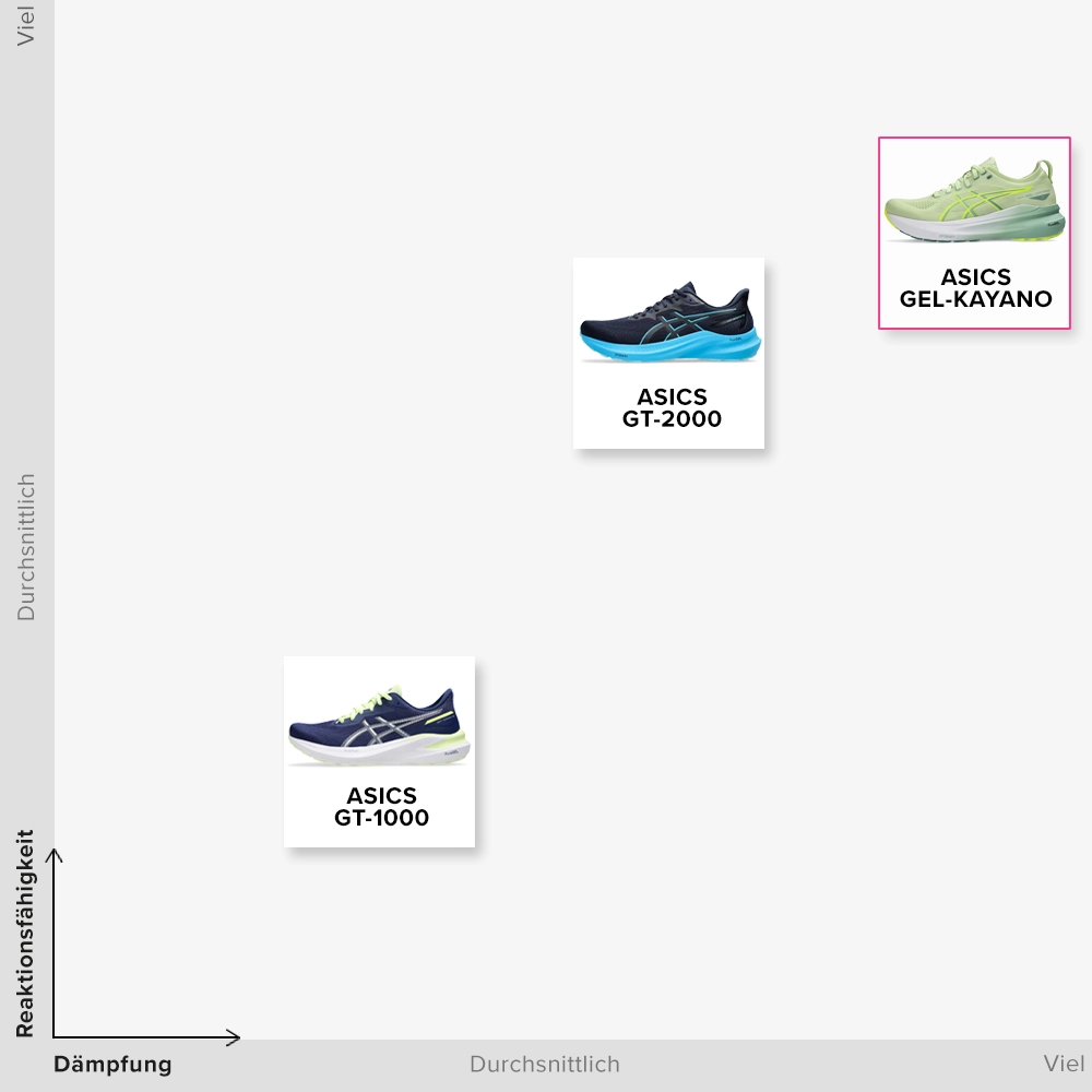In der Run Further-Kollektion findest du Modelle, die für dein tägliches Training gemacht sind. In dieser Kategorie gibt es mehrere stabile Optionen. So gibt es zum Beispiel den ASICS GT-1000 12 für Laufanfänger, die noch nicht so viel Dämpfung benötigen. Der GT-2000 12 ist für begeisterte Läufer gedacht, die mehr Dämpfung und Komfort suchen, und dann gibt es noch den GEL-KAYANO 31 für Läufer, die maximalen Komfort suchen.