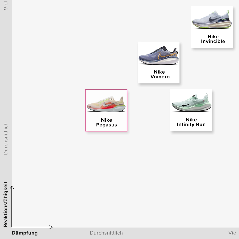 Bist du auf der Suche nach einem Allround-Laufschuh? Nike hat eine große Auswahl an Laufschuhen, die du jeden Tag tragen kannst, egal welches Training du machst. Der Nike Pegasus ist das beliebteste Modell mit ausgewogener Dämpfung und zwei Nike Zoom Air Units. Der Nike Vomero 17 ist eine Dämpfungsstufe höher. Dieses Modell verfügt über eine ZoomX-Zwischensohle und ist daher für lange Läufe geeignet. Maximale Dämpfung, maximaler Komfort – das ist das Motto des Nike ZoomX Invincible Run Flyknit 3. Dieser Laufschuh verfügt über eine extra dicke ZoomX-Zwischensohle mit mehr Stabilität dank einer breiteren Sohle. Der Nike ReactX Infinity Run Flyknit 4 ist der leichte Allrounder, der ein stabiles und reaktionsfreudiges Lauferlebnis bietet.