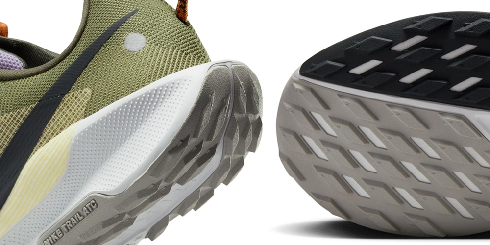 Die Außensohle des Pegasus Trail 5 enthält Nikes neues All-Terrain-Compound-Gummi. Dieses verschleißfeste Material bietet auch bei Nässe zusätzlichen Grip. Die 3,5 Millimeter großen Stollen sind so platziert, dass sie ausreichend Grip auf den Trails bieten, ohne dass man sie beim Laufen auf der Straße spürt.