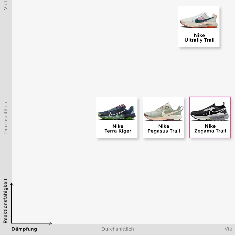 Mit dem Nike Pegasus Trail hast du einen vielseitigen Trailrunning-Schuh an deinen Füßen. Dies ist auch ein idealer Trailrunning-Schuh für unerfahrene Trailläufer, die regelmäßig sowohl auf Trails als auch auf asphaltierten Wegen laufen. Du wohnst nicht in der Nähe einer Trailroute? Dann kann man mit dem Pegasus Trail auch ohne Probleme ein Stück auf dem Asphalt laufen. In den Bergen und bei anspruchsvollen Trailläufen kommt der ZoomX Zegama voll zur Geltung. Der ZoomX ist der bequemste Trailrunning-Schuh, wenn dir Dämpfung und ein weiches Tragegefühl unter den Füßen wichtig sind.