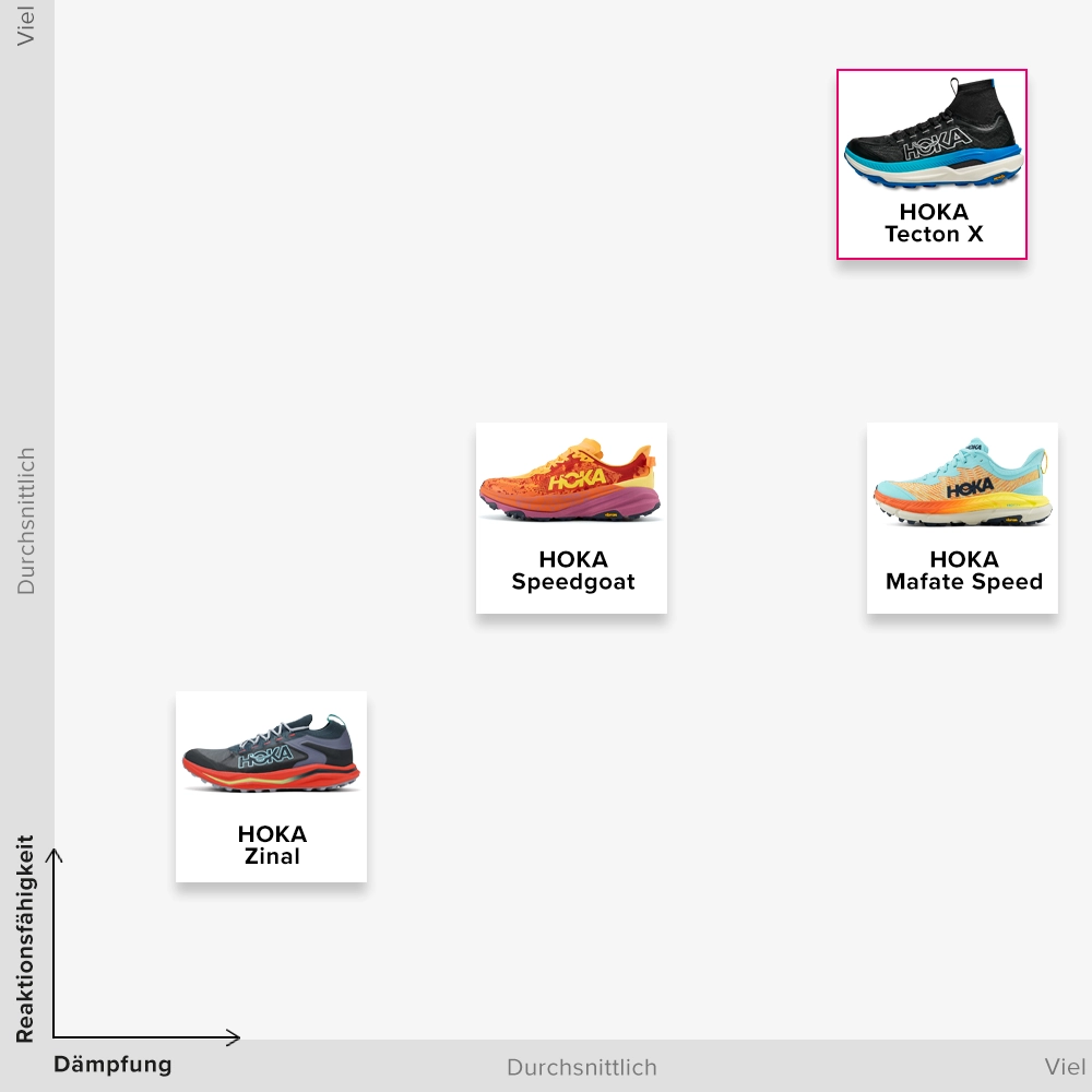Der HOKA Mach ist ein leichtgewichtiger Allrounder, der sich ebenfalls sehr gut für das Intervall- und Tempotraining eignet. Der Cielo X 1 hat aufgrund der PEBA-Superfoam-Zwischensohle in Kombination mit einer Carbonplatte einen etwas schnelleren Charakter. Für kürzere Wettkämpfe steht der Cielo RD zur Verfügung, der mit einer dünneren Zwischensohle und einer Carbonplatte punktet. Dadurch ist dieses Modell auf kurvenreichen Strecken besonders stabil.
