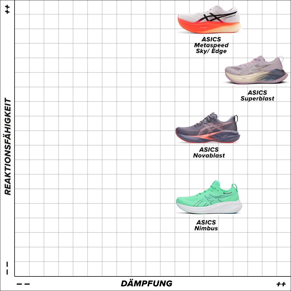 Der Novablast 5 ist Teil der „Run Faster“-Kollektion von ASICS. Dies sind Laufschuhe, die darauf ausgerichtet sind, beim Training und bei Wettkämpfen schnelle Zeiten zu laufen. „Run Faster“ hilft dir, mühelos in den höchsten Gang zu schalten. Der ASICS Novablast 5 ist ein Temposchuh, den du auch als Allrounder verwenden kannst. Möchtest du einen Halb- oder Vollmarathon so bequem wie möglich laufen? Dann wähle den ASICS Superblast. Entscheidest du dich lieber für die besten und schnellsten Wettkampfschuhe, um Rekorde zu vernichten? Dann ziehe den ASICS Metaspeed Sky oder den Edge in Betracht. Setze dir deine Ziele und wähle für jedes Training oder Rennen die passenden Laufschuhe von ASICS.
