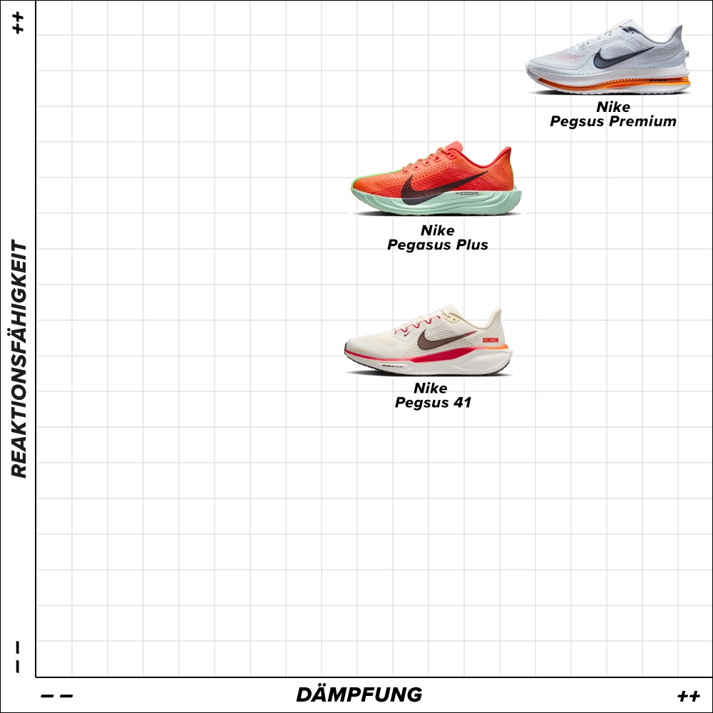 Wenn du einen guten Laufschuh für dein tägliches Training suchst, ist der ‚normale‘ Pegasus 41 eine gute Wahl. Dies ist ein neutraler Schuh, der dank des ReactX-Schaumstoffs und der Air Zoom-Einheiten im Vorfuß- und Fersenbereich reaktionsfreudig und nicht zu schwer ist. Suchst du einen Schuh für schnelle Trainings? Dann ist der Pegasus Plus der Schuh für dich. Der Pegasus Plus ist wesentlich leichter und alles dreht sich um Geschwindigkeit. Mit einer Zwischensohle aus reaktionsfreudigem ZoomX-Schaumstoff fliegst du nur so vorwärts. Der Pegasus Plus ist ein idealer Tempolaufschuh für Läufer, die ohne Platte im Schuh trainieren wollen. Möchtest du maximale Reaktionsfähigkeit und Komfort? Dann entscheide dich für den Pegasus Premium. Die einzigartige, dreilagige Sohlenkonstruktion macht diesen Pegasus zum reaktionsfreudigsten Pegasus aller Zeiten. Der Premium hat außerdem eine dickere Sohle, die ihn noch bequemer macht. So kannst du härter und länger trainieren.