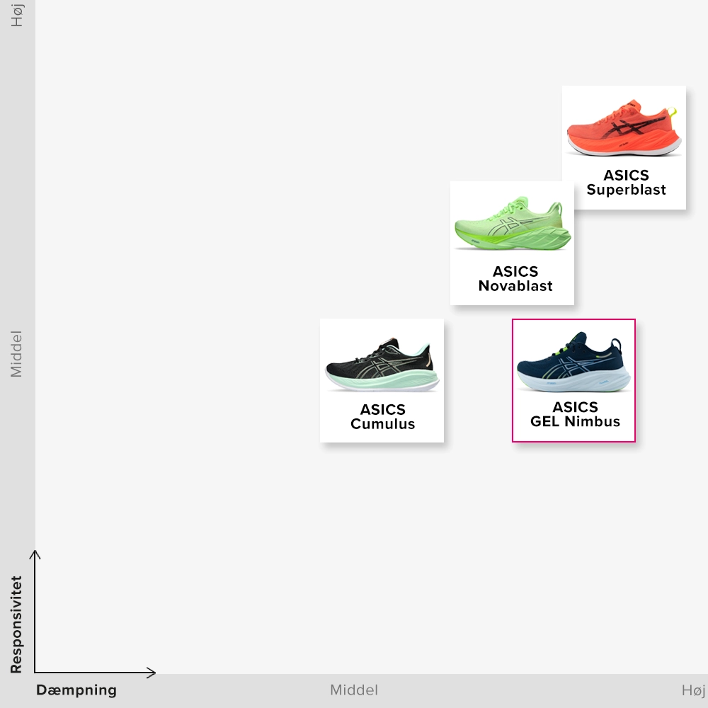 Vil du finde ud af, hvad den bedste ASICS-løbesko er til dig? Så skal du først være opmærksom på, om du er en neutral løber, eller om du har tendens til overpronation. Det kan du nemt finde ud af via vores Online Shoe Advisor. ASICS har mange forskellige typer løbesko til den neutrale løber. For eksempel er Cumulus og Nimbus bedst egnet til nybegynderen eller løberen, der foretrækker at løbe længere distancer. ASICS Novablast og Superblast fokuserer lidt mere på tempotræning og er en del af ASICS’ “Run Faster”-familie. Find ud af, hvad dit mål er, og vælg derefter den passende ASICS- løbesko til hvert træningspas.