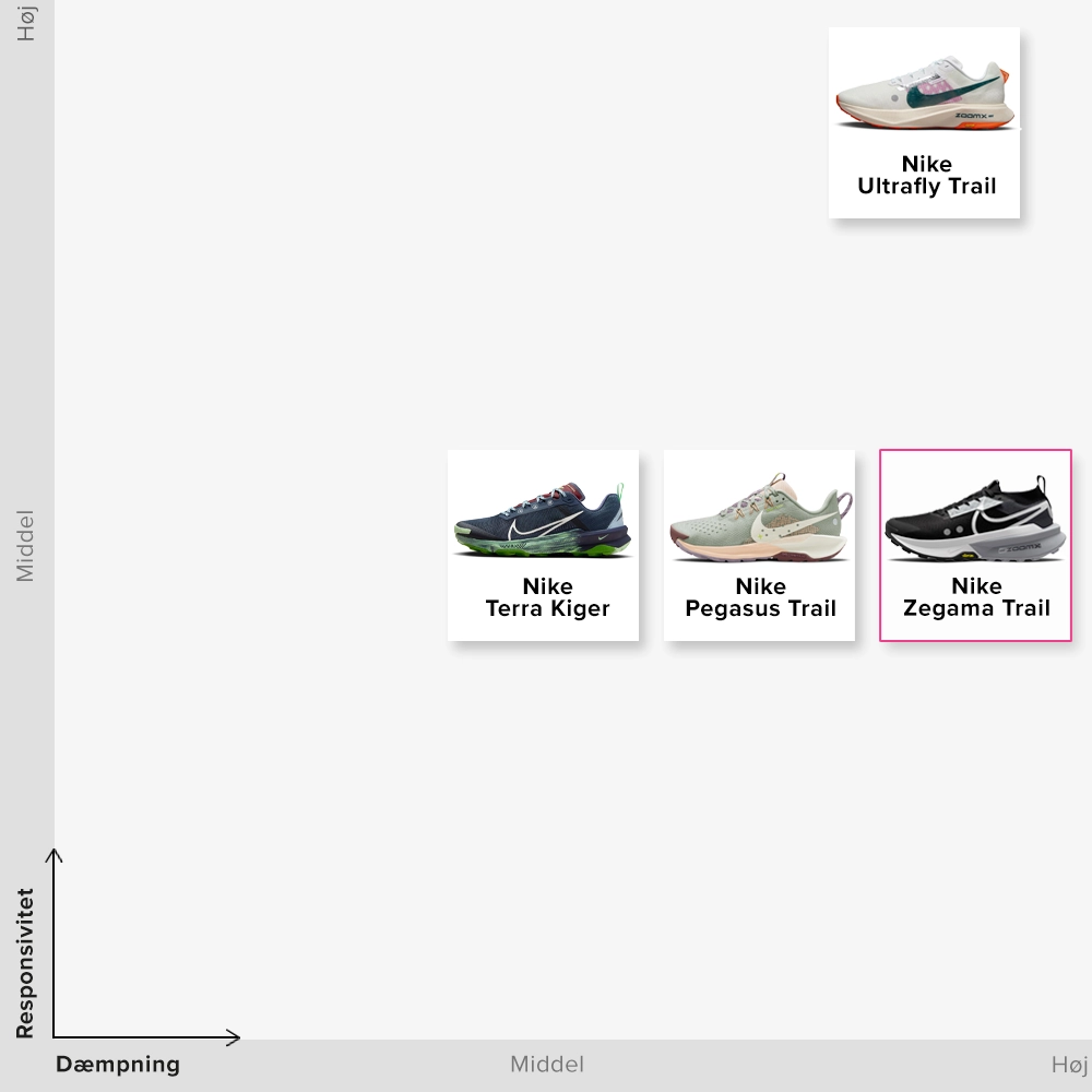 Med Nike Pegasus Trail har du et alsidigt par trailsko på fødderne. Trailskoen er også ideel til den uerfarne trailløber, der løber regelmæssigt på både stier og asfalterede veje. Bor du ikke lige i nærheden af en trailrute? Så kan du sagtens løbe asfalten ud til stierne med Pegasus Trail. ZoomX Zegama kommer mest til sin ret i bjergene og under de mere udfordrende trailløb. ZoomX er den mest komfortable trailsko, hvis du lægger vægt på støddæmpning og en blød fornemmelse under fødderne.