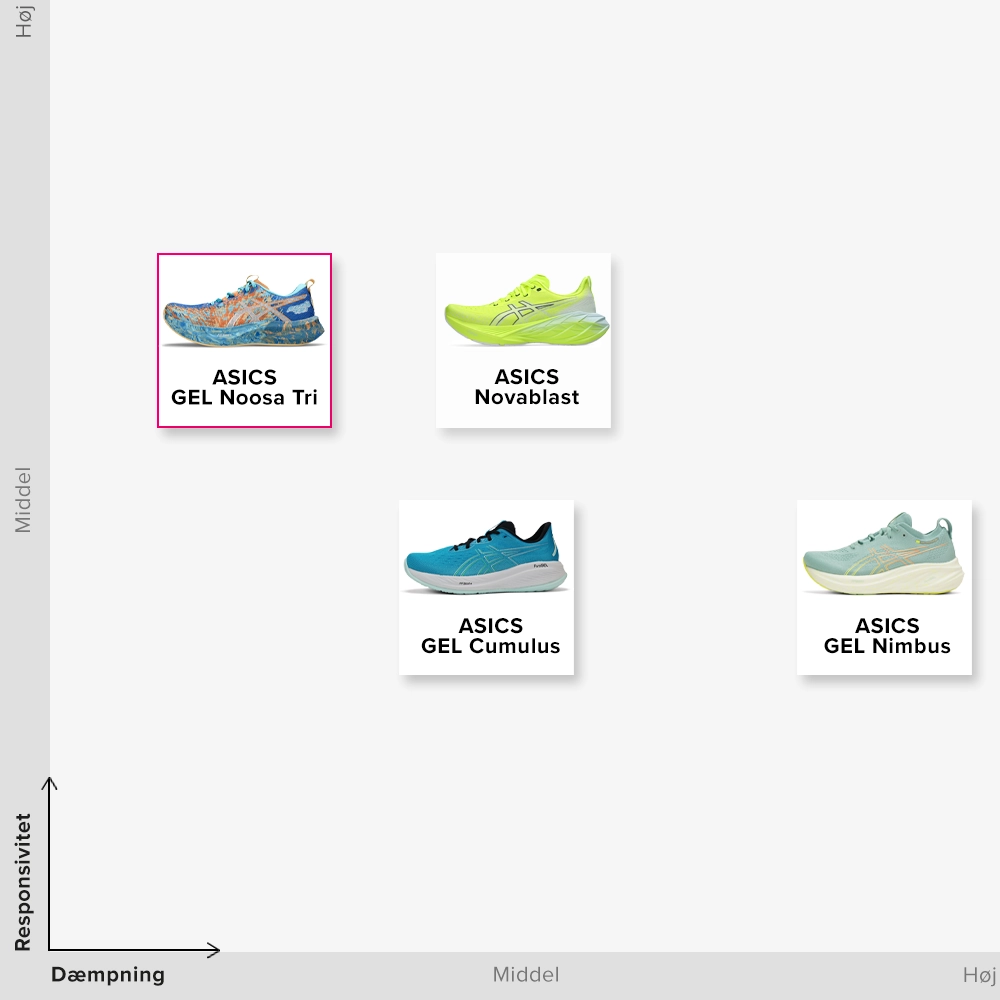 ASICS Noosa Tri 16 og Novablast 4 er to modeller af allround-løbesko med en lidt hurtigere karakter. Den store forskel ligger i vægt, offset og såltykkelse. Novablast har en tykkere mellemsål og et højere offset på 8 mm, hvilket gør den velegnet til halv- og helmaraton. Noosa Tri er lidt lettere i vægt, har 5 mm offset og egner sig bedst til distancer op til halvmaraton.