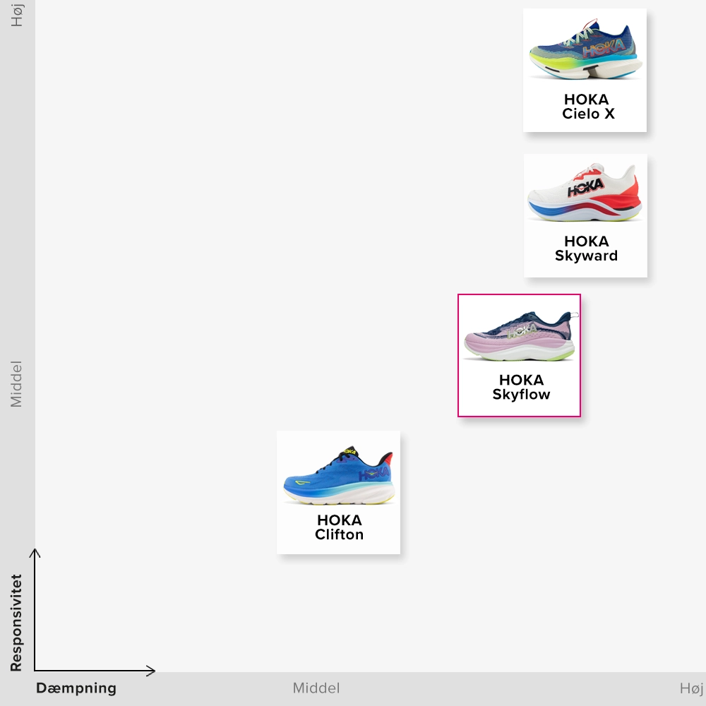 Vil du vælge den bedste HOKA-løbesko? Så sørg for først at have helt tjek på, om din fodstilling er neutral eller med overpronation. Det kan du nemt gøre via vores online shoe advisor. HOKA har forskellige typer af løbesko. Helt overordnet kan man inddele dem i kategorierne Glide, Fly og Sky. HOKA Glide-kategorien indeholder allround-løbesko til rolig træning som HOKA Clifton og Bondi. HOKA Fly-kategorien indeholder alle sko, der er rettet mod fart, som Skyward X, Skyflow, Cielo X og Rocket X. Trail-entusiaster kan kigge på Sky-kategorien, som er en samling af trailsko til løb på stierne. Bestem dit mål for at vælge den passende HOKA-løbesko til enhver træning eller ethvert konkurrenceløb.