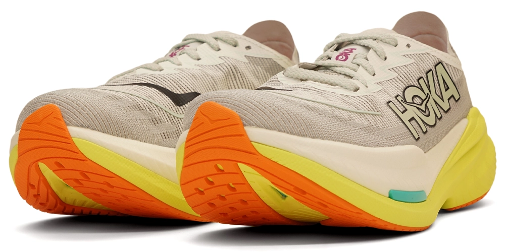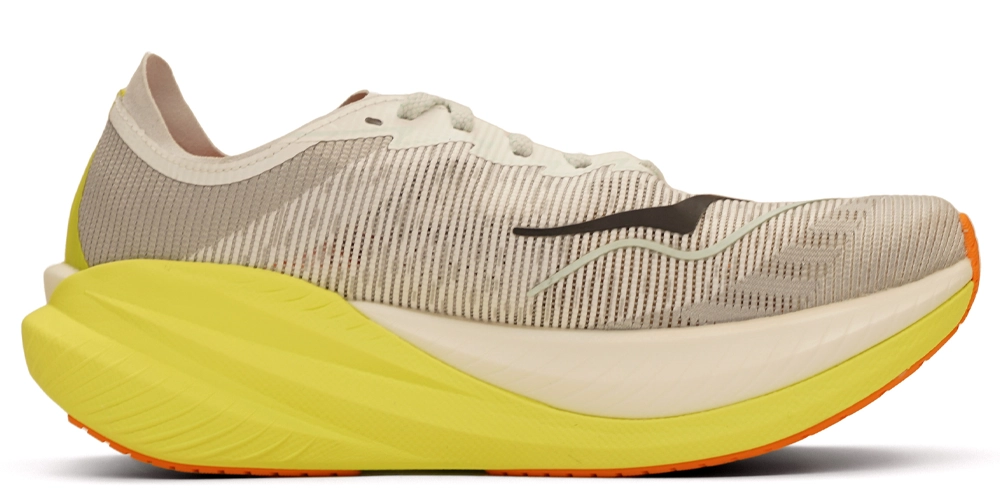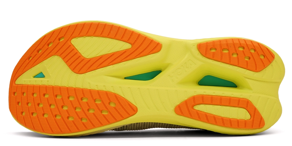 Sålens afrundede design er inspireret af HOKA Cielo X 1, den ultimative konkurrencesko med carbonplade. Denne aggressive afrunding og et lavt offset på 5 mm gør denne model bedst egnet til mellem- og forfodsløbere. Faktisk er det mere sandsynligt, at en løber med hæl vil mærke sine lægge eller akillessener på grund af det lavere offset.