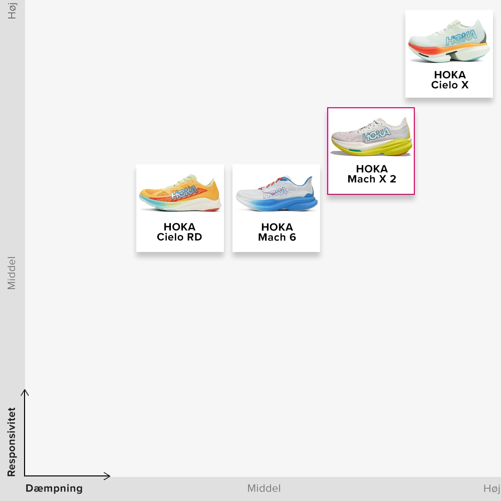 HOKA Mach er en let allrounder, som også er god til interval- og tempotræning. Cielo X 1 har en lidt hurtigere karakter på grund af PEBA-superfoam-mellemsålen kombineret med en carbonplade. Til kortere konkurrenceløb er der Cielo RD, som har superfoam, en tyndere mellemsål og carbonplade. Det gør denne model lidt mere stabil på en rute med flere sving.