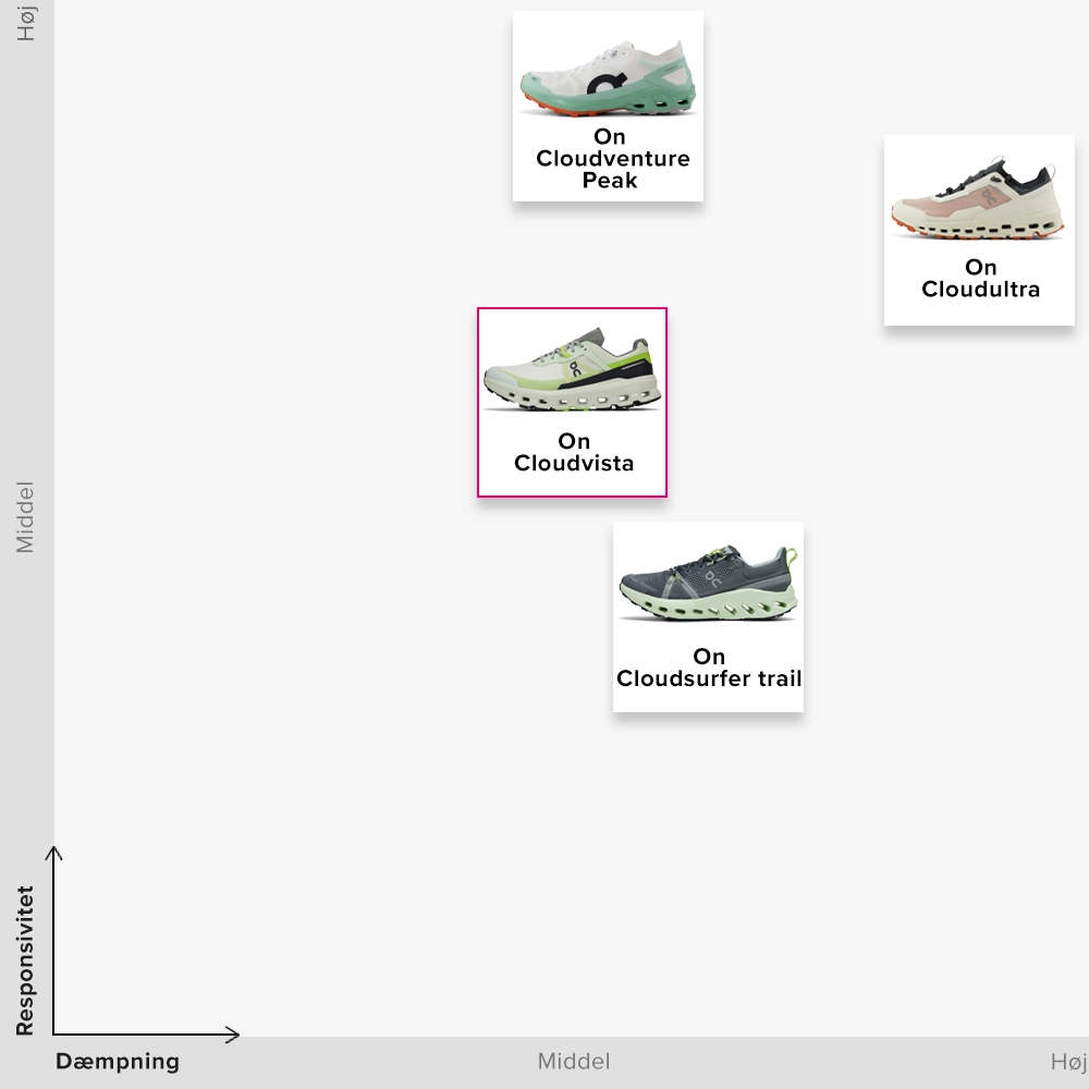 Vil du vælge den bedste trailsko fra On? Så skal du beslutte dig for hvilken distance du vil tilbagelægge og det terræn du vil løbe i. On Cloudvista 2 (+WP) og Cloudsurfer Trail (+WP) er lette allround trailsko til korte til mellemlange distancer på landevejen og lette til moderate stier. Cloudvista 2 er mere responsiv mens Cloudsurfer Trail giver mere støddæmpning. Fans af lange og ultralange distancer vil nyde On Cloudultra og On Cloudventure Peak. Cloudultras maksimale støddæmpning gør den perfekt til meget lange træningspas i både teknisk og lettere terræn. Cloudventure Peak er den ideelle sko til trailløb da den giver god fart og greb på de mest tekniske stier.