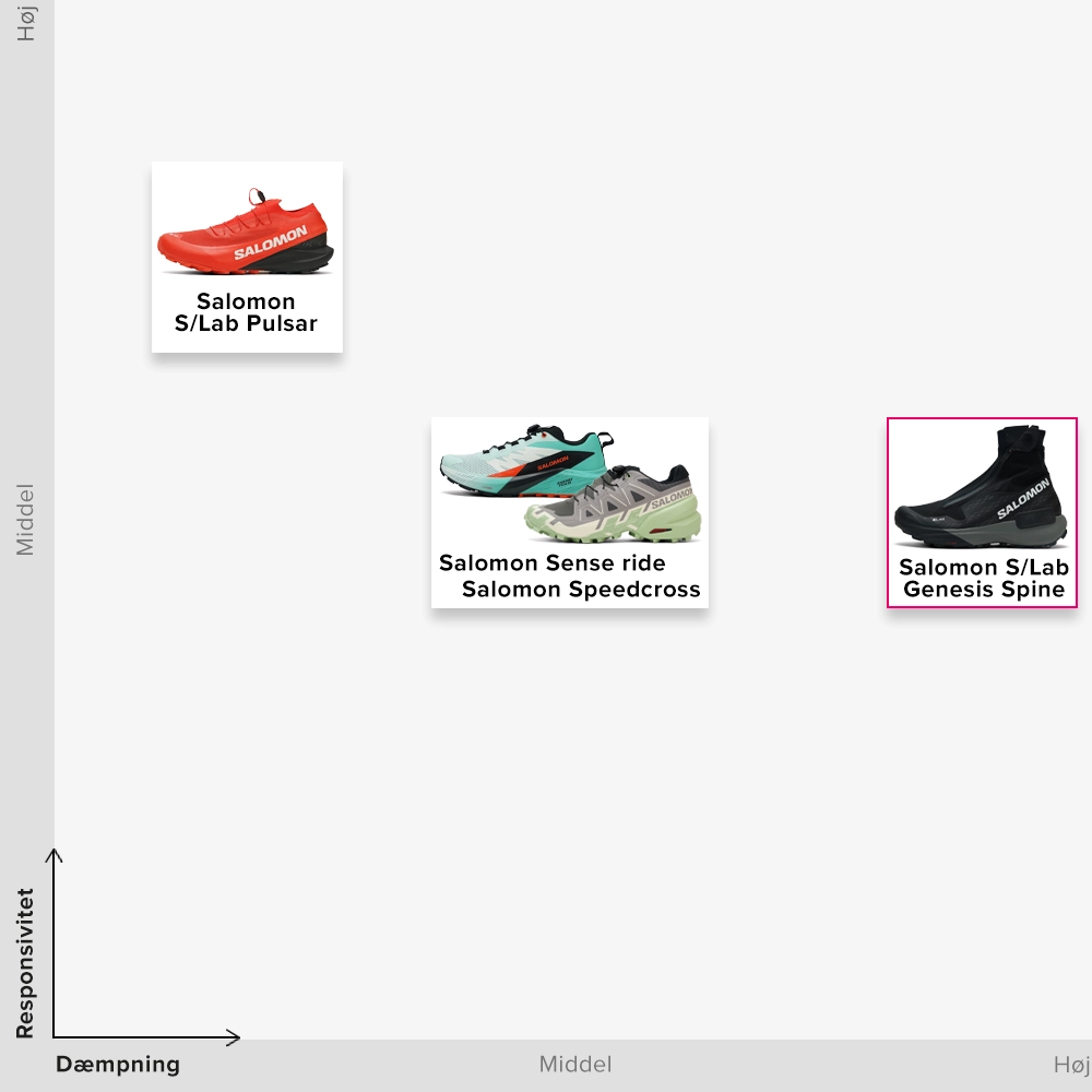 Salomon Sense Ride er den mest alsidige trailsko, der giver dig mulighed for at løbe både korte og lange distancer. Speedcross er den perfekte trailsko, hvis du vil op i de høje bjerge, da det grove mønster og knopprofilen gør, at du altid har optimalt greb. Og for skyrunning-fans er der Salomon S/Lab Alpine, den lette og dynamiske trailsko til at overvinde mange højdemeter på kort tid.