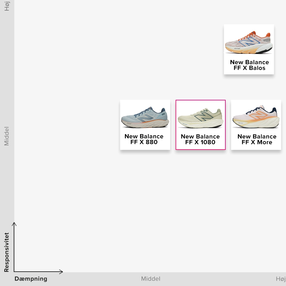 New Balance 1080v14 er en del af Fresh Foam X-familien. Fresh Foam X-kollektionen har fået sit navn fra New Balances støddæmpningsmateriale. Sålerne er udviklet på baggrund af data fra tusindvis af løbere. Fresh Foam X-sålen leverer forskellige typer støddæmpning og støtte på forskellige dele af skoen. De mest populære neutrale Fresh Foam X-modeller er 880 og 1080. Der findes også New Balance Fresh Foam X More til alle dem, der elsker maksimal støddæmpning. Og med New Balance Balos har du en sko med maksimal støddæmpning og maksimal energireturnering til tempotræning. Så der er en passende model til enhver løber.