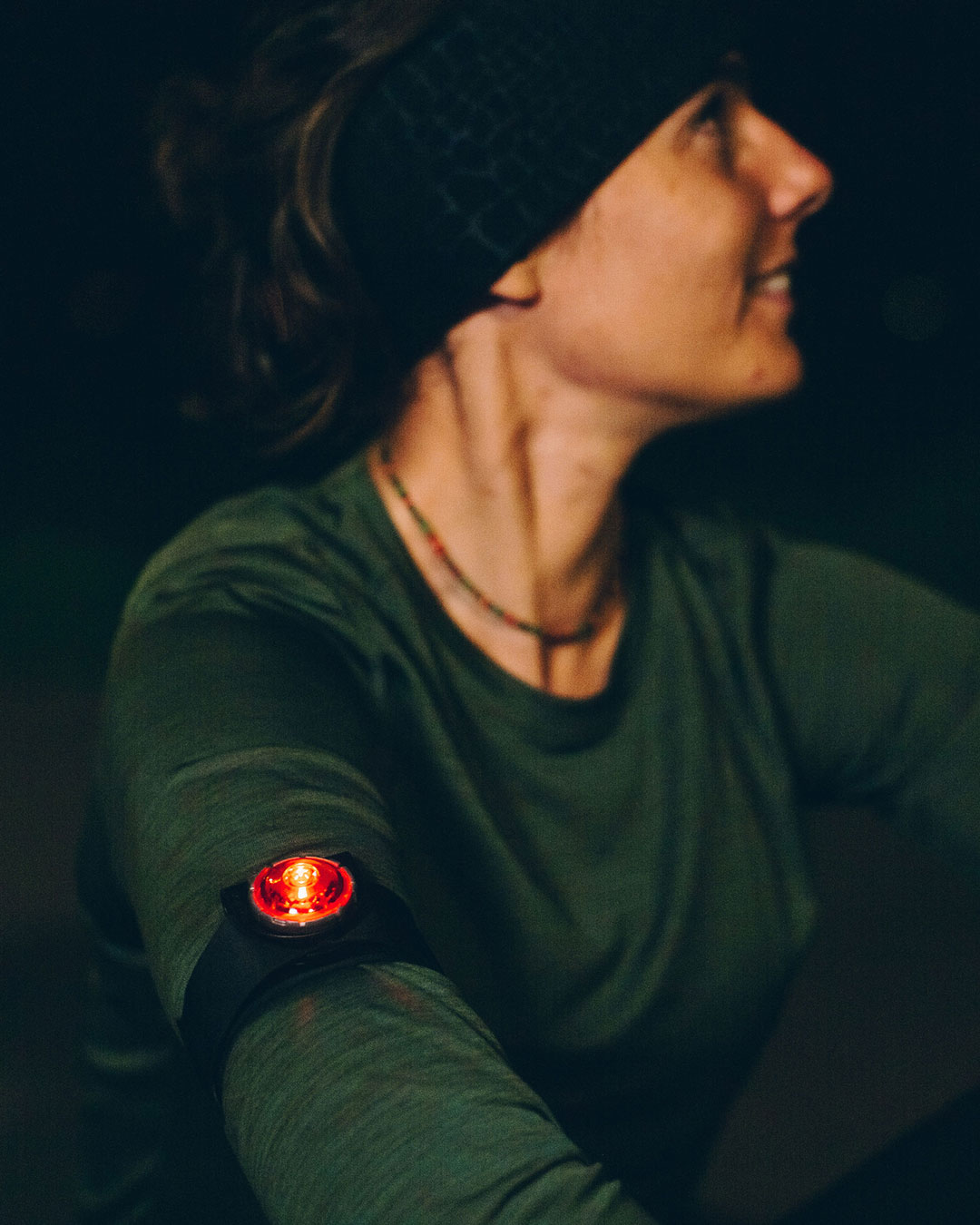You can wear the LED light on your upper arm. The fit can be adjusted quickly and easily using the Velcro fastener. The light also withstands a spontaneous rain shower and boasts two different light modes.