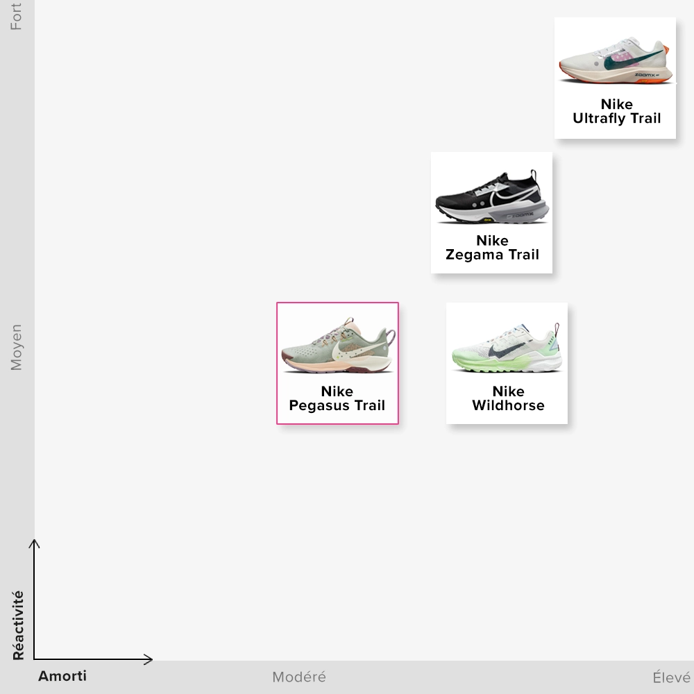 Nike a une vaste collection de chaussures de trail pour différents types de trails. Si vous recherchez une chaussure légère et agile, optez pour la Terra Kiger ou l’Ultrafly. Cette dernière est équipée d’une mousse très réactive et d’une plaque de carbone. Pour les coureurs de trail débutants, il y a aussi la Juniper Trail, légèrement plus ferme que la Pegasus Trail. Pour les trails plus longs et plus exigeants, nous recommandons la Wildhorse et la Zegama. Cette dernière est la plus réactive des deux.