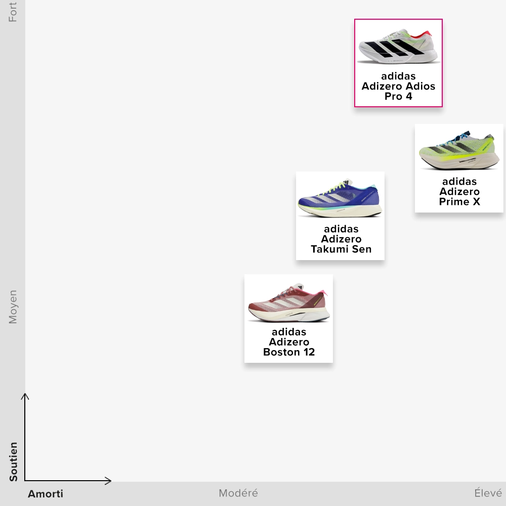 Vous voulez choisir la meilleure chaussure de compétition adidas ? Utilisez notre Shoe Advisor ou consultez notre matrice de chaussures qui classe les chaussures en fonction de l’amorti et du retour d’énergie (réactivité).