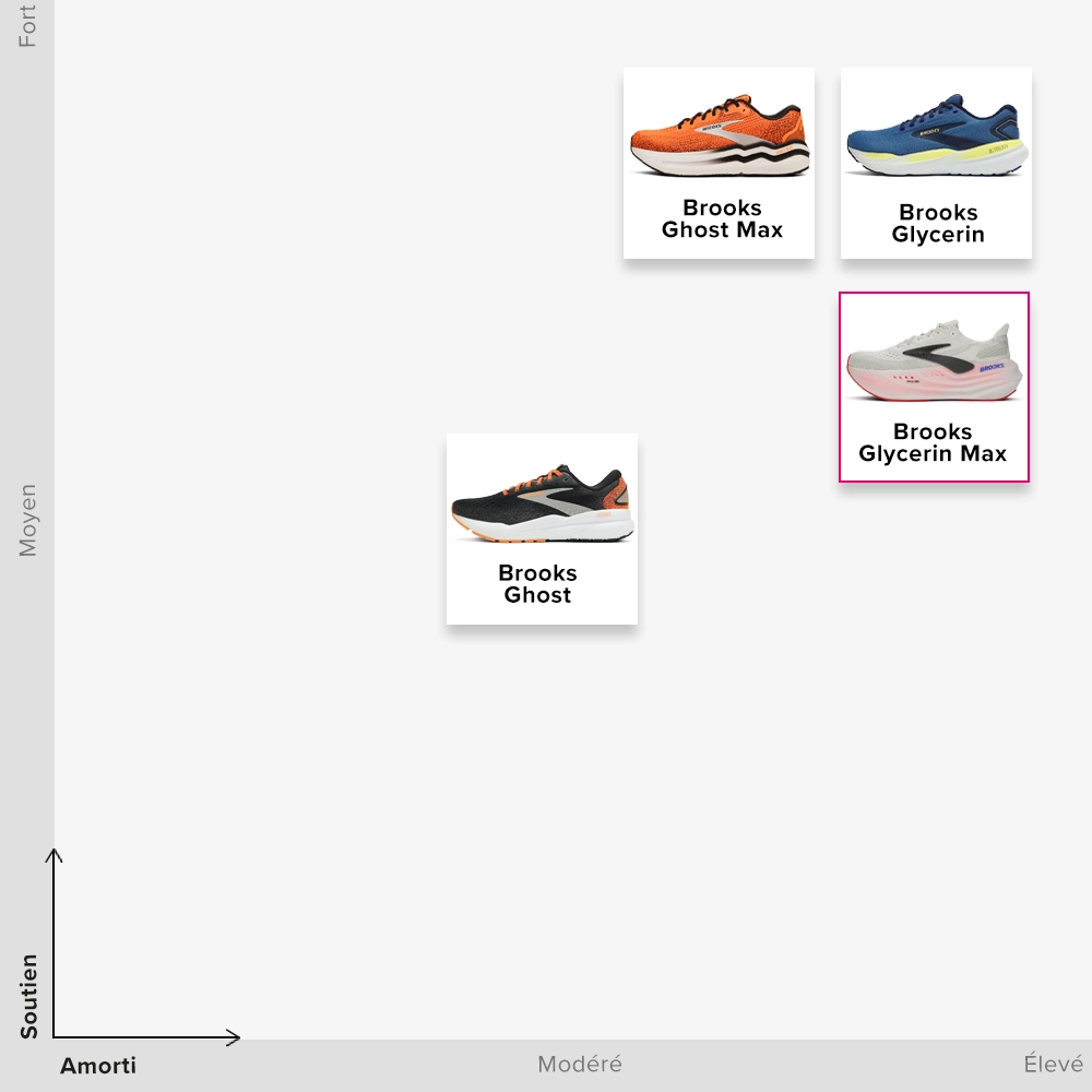 Brooks propose différents modèles de chaussures de running pour les coureurs neutres. La Ghost et la Glycerin sont les plus populaires pour les courtes et longues distances. La Ghost Max 2 est la chaussure de running Brooks qui offre le plus d’amorti. La Glycerin Max offre un amorti maximal, tout en étant légère et souple. Vous cherchez des chaussures de running avec un peu plus de soutien ? Dans ce cas, vous êtes à la bonne adresse avec l’Adrenaline GTS et la Glycerin GTS.