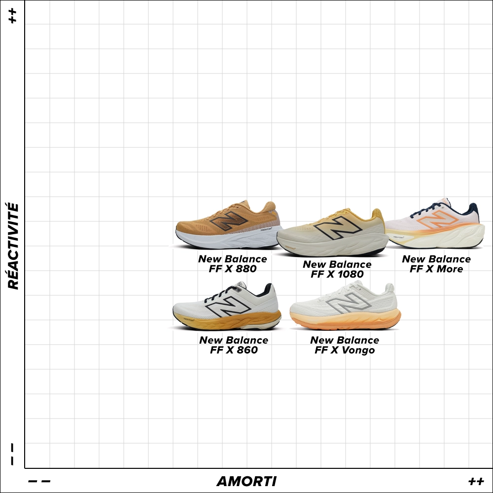 La collection New Balance Fresh Foam X comprend des chaussures de running polyvalentes adpatées à chaque type de coureur et à chaque objectif de course. Il s’agit de chaussures conçues pour les entraînements quotidiens et non pour la vitesse. Ces modèles permettent à ceux qui débutent en course à pied de progresser à leur rythme, et offrent aux coureurs expérimentés la possibilité de travailler leur technique de course et leur endurance à travers divers entraînements. Vous voulez choisir la meilleure chaussure de running polyvalente New Balance ? Notre online shoe advisor vous aidera à le faire.