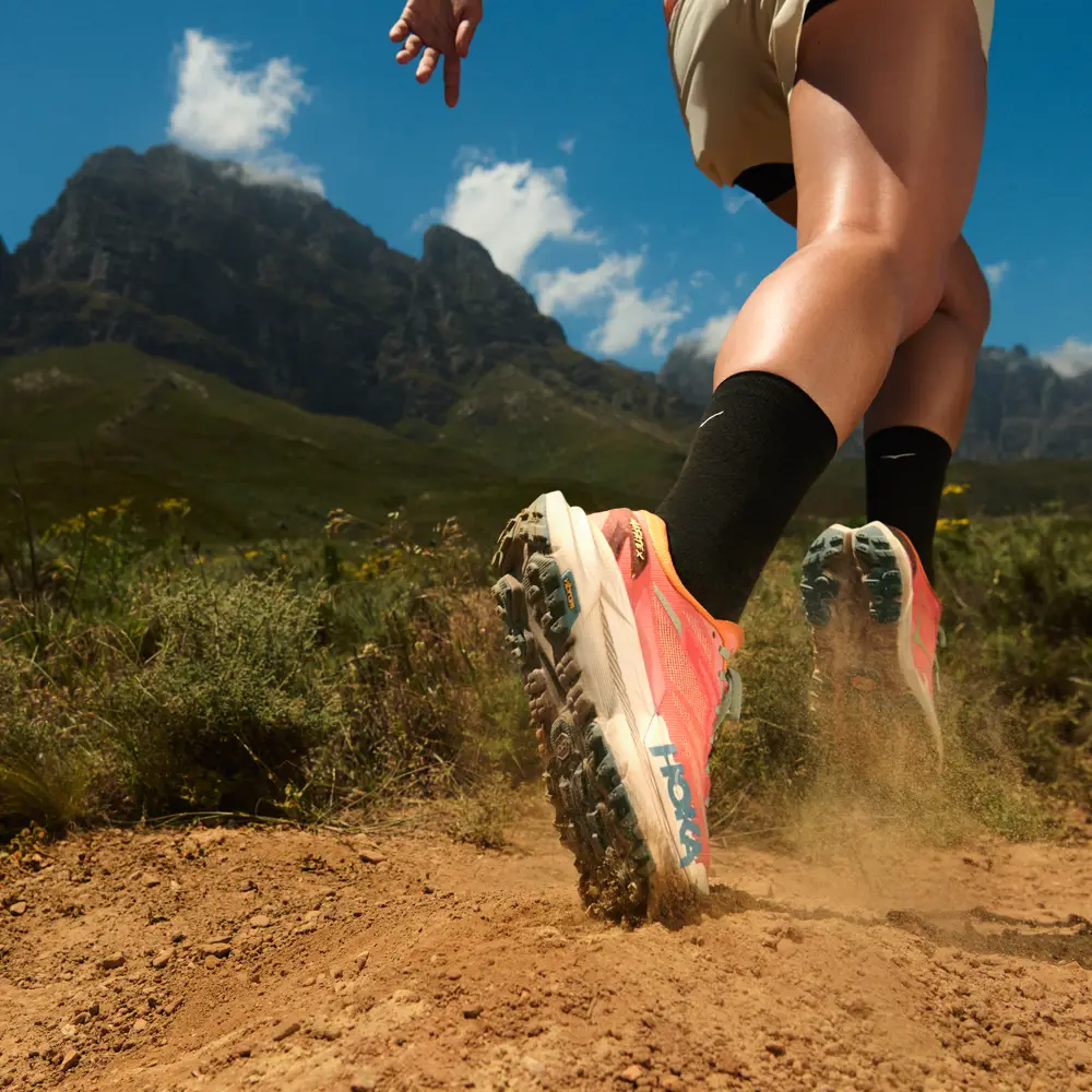 Mit einer reaktionsfreudigen Carbonplatte, einer ultradicken Dämpfung und Vibram® Megagrip ist dies der bisher technischste Trailrunning-Schuh von HOKA.