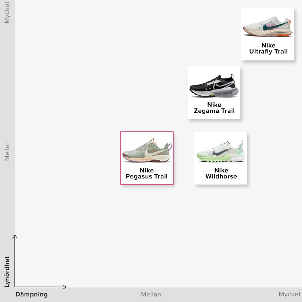 Nike har en omfattande trailsko-kollektion för olika typer av traillöpning. Om du vill ha en lätt och smidig känsla finns Terra Kiger och Ultrafly, där den senare är försedd med det mest responsiva skummet samt en kolfiberplatta. För nybörjaren finns också Juniper Trail, som är till och med ännu lite fastare än Pegasus Trail. För längre och mer krävande traillöpningar har vi Wildhorse und den Zegama, där Zegama är aningen mer responsiv.