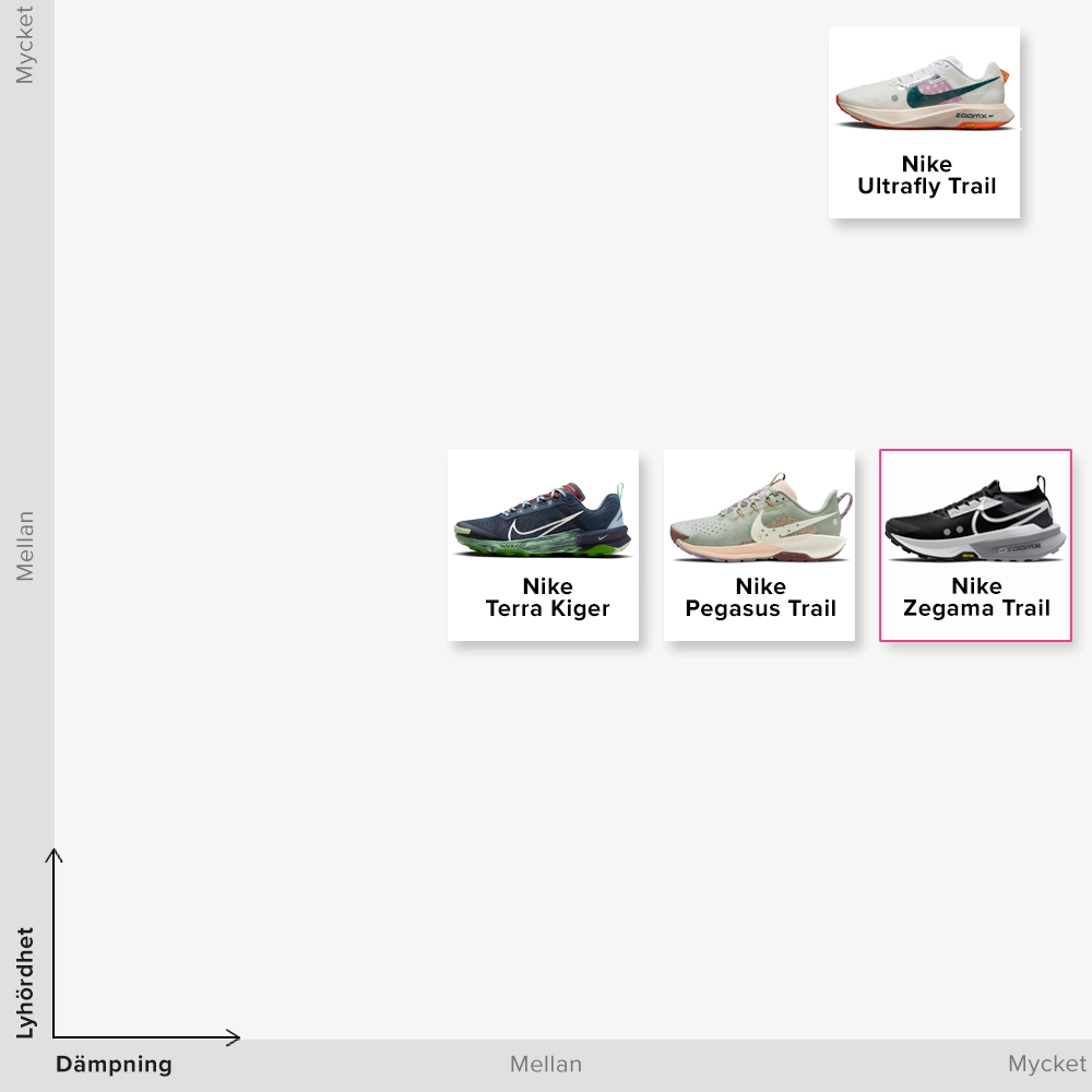 Med Nike Pegasus Trail har du en mångsidig trailsko på fötterna. Den är också en perfekt trailsko för nybörjare som regelbundet springer på både stigar och landsvägar. Har du en bit att ta dig till din trailrunda? Då kan du absolut springa en sträcka även på asfalt med Pegasus Trail. ZoomX Zegama kommer mest till sin rätt i bergiga miljöer och på krävande trailrundor. Om du uppskattar dämpning och en mjuk känsla under fötterna är ZoomX den absolut bekvämaste trailskon.