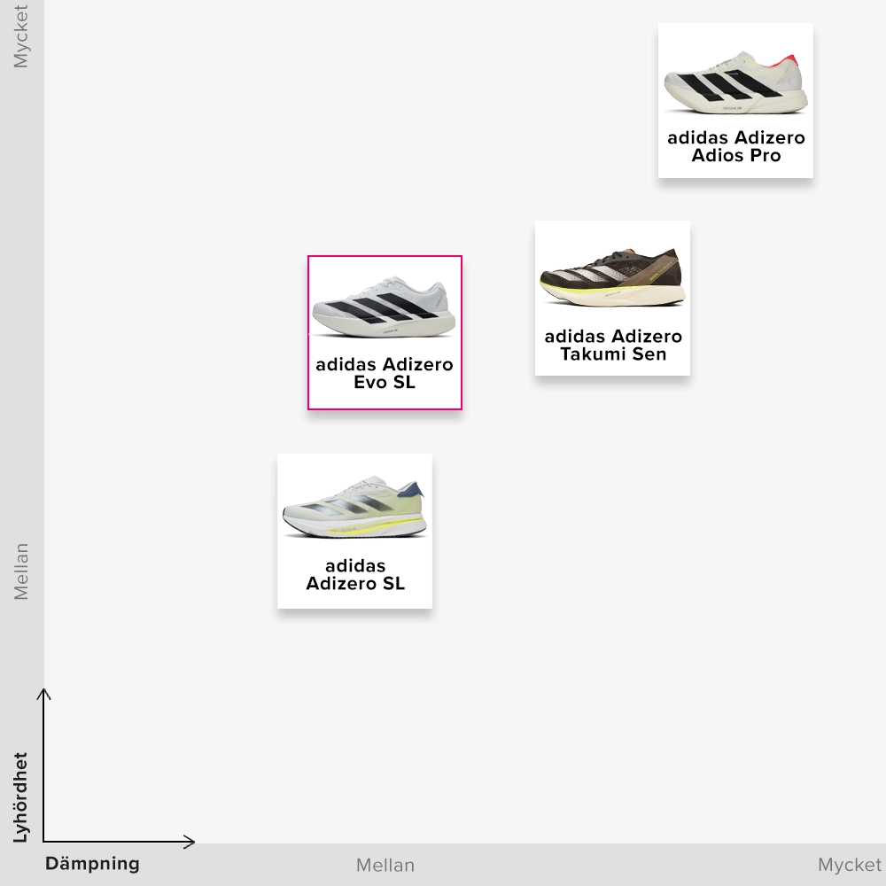 Vill du välja de bästa adidas tempo- och tävlingsskorna? Fyll då i vår Online Shoe Advisor eller ta en titt på vår skomatris där vi ordnar skorna efter dämpning och energiåtergivning (responsivitet).