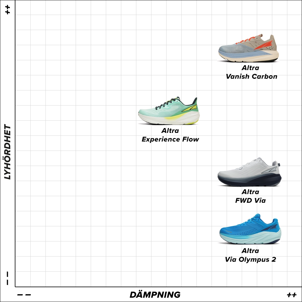 Om du letar efter en allroundsko med maximal dämpning och komfort för dina dagliga löprundor eller långa uthållighetsträningar kan du välja Altra FWD Via (4 mm drop) eller Altra Via Olympus 2 (zero drop). För snabbare löprundor finns Altra Torin 8 (zero drop) och Altra Experience Flow (4 mm drop). Dessa två modeller finns även i en version för löpare med överpronation, Paradigm 7 (zero drop) och Experience Form (4 mm drop).