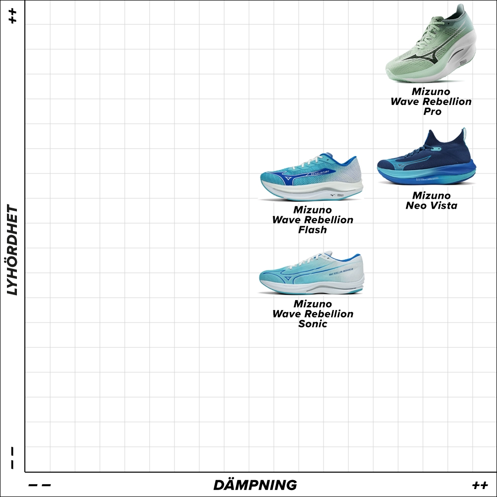 Mizuno Wave Rebellion Pro 3 är en del av Mizunos kollektion av tävlingsskor, särskilt utformade för löpare som vill ha prestanda och snabbhet. I kombination med Rebellion Wave Sonic 2 och Mizuno Wave Rebellion Flash 2 har Mizuno ett komplett sortiment för alla typer av träning, allt från långa uthållighetsrundor till snabba intervaller och tävlingar. Rebellion Sonic 2 är en allroundsko med något snabbare egenskaper tack vare sin låga vikt. Rebellion Flash 2 är den perfekta temposkon för dina korta och långa intervallträningar. Är du ute efter en mycket speciell och bekväm löparupplevelse? Då ska du snöra på dig Mizuno Neo Vista eftersom den här skon har två lager superreaktivt skum och en plastplatta som ger extra stabilitet och energifylld löpning.