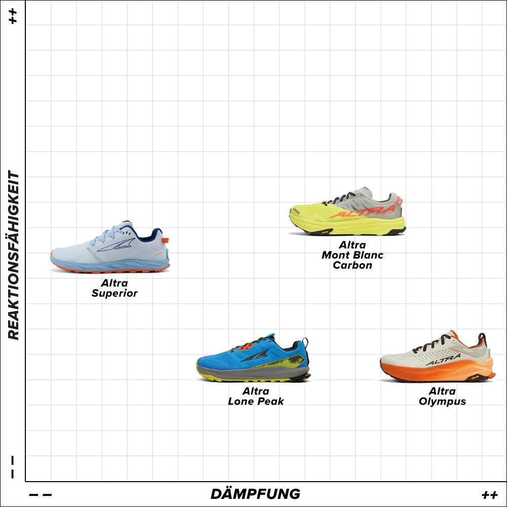 Med sin slitstarka ovandel, balanserade dämpning, stabilitet och överlägsna grepp är Altra Lone Peak 9+ den mest populära modellen. Långdistanslöpare kommer att älska den långvariga komforten i Altra Olympus 6 tack vare den maximala dämpningen. Om du är ute efter en lättare och mer dynamisk trailsko med mindre dämpning för kortare distanser kan du välja Altra Superior 6. Och för de mest entusiastiska traillöparna finns Altra Mont Blanc Carbon, trailskon med kolfiberplatta utformad för tävlingslopp.