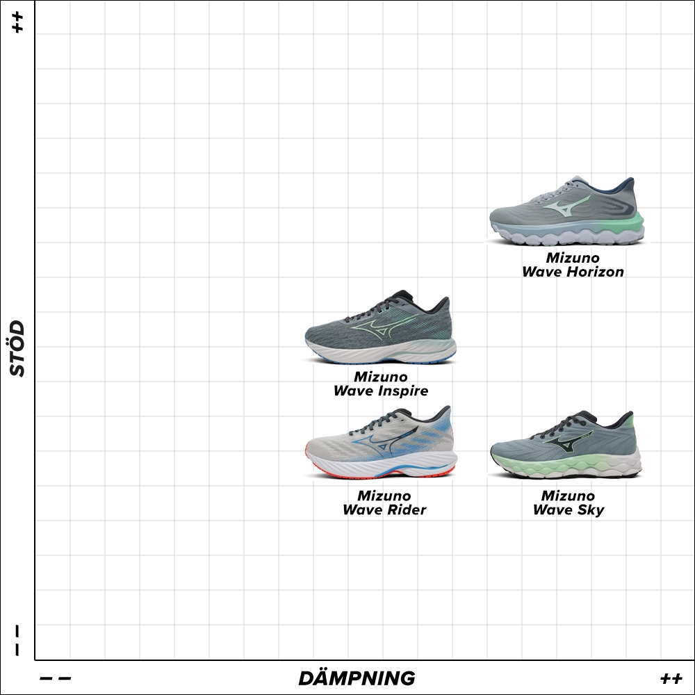 Mizuno har fyra löparskor som är mest populära – Wave Rider och Wave Sky för neutrala löpare och Wave Inspire och Wave Horizon för överpronerande löpare. Är du osäker på om du har en neutral eller överpronerande fotställning? Fyll då i vår online shoe advisor och se vilka av Mizunos löparskor som passar bäst för just dig.