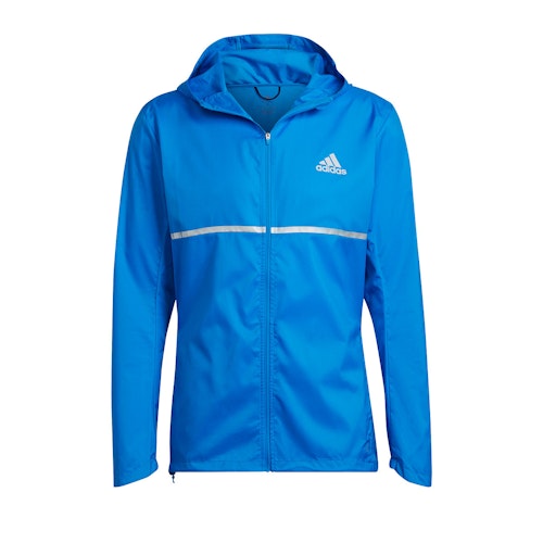 Own The Run Jacket til mænd er en løbejakke med hætte. Jakken har en god pasform og er meget behagelig at løbe med. Over venstre bryst er der et adidas-logo. Jakken holder dig tør i let regn. Jakken indeholder reflekterende elementer, så du er meget synlig i mørket. Der er to lommer på forsiden til opbevaring af værdigenstande. Ærmerne er formet på forhånd, så de passer godt rundt om armene.