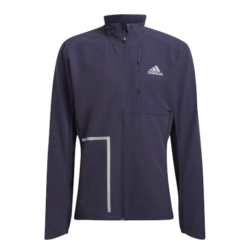Own The Run Jacket til mænd er en løbejakke med hætte. Jakken har en god pasform og er meget behagelig at løbe med. Over venstre bryst er der et adidas-logo. Jakken holder dig tør i let regn. Jakken indeholder reflekterende elementer, så du er meget synlig i mørket. Der er to lommer på forsiden til opbevaring af værdigenstande. Ærmerne er formet på forhånd, så de passer godt rundt om armene.