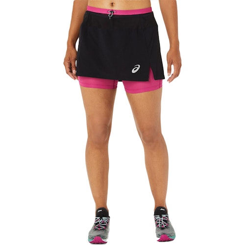 ASICS FujiTrail Skort til kvinder er en løbeshorts med en nederdel over den. De indvendige shorts har en stram pasform for målrettet støtte. Materialet transporterer godt fugten væk og føles blødt mod huden. Nederdelen over de indvendige shorts har en løs pasform for et stilfuldt look. Den bredere linning holder skort'en på plads, mens du løber. Flere lommer giver dig mulighed for sikkert at bære gels, barer eller mindre ting. Den fugtafvisende lynlåslomme på bagsiden giver dig mulighed for at tage din mobiltelefon med på løbeturen.