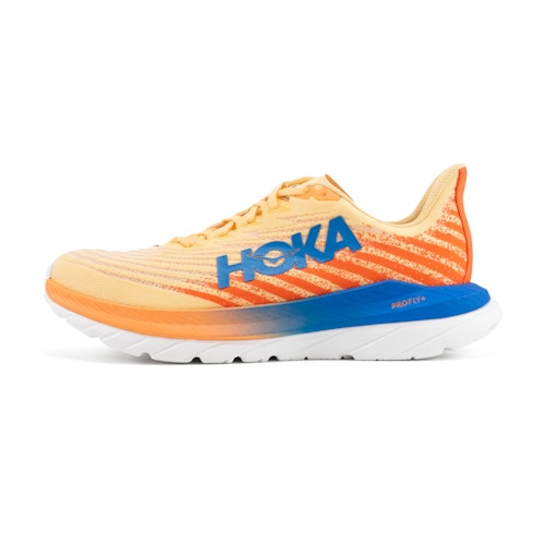 HOKA Mach 5 er neutrale løbesko. Teknologierne fra Mach 4 og Mach Supersonic samles i denne lette træningssko. Denne hurtige sko fra HOKA kaldes også "Carbon X" uden carbonplade.