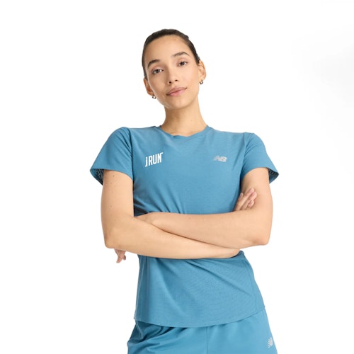 SKU: WT41281TEI Varegruppe: Løbe T-shirts Pasform: Regular Farve: Blå Køn: Dame Mærke: New Balance Materiale: 74% genanvendt polyester 26% spandex