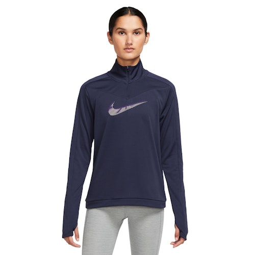 Dri-FIT Swoosh Running Shirt er en behagelig løbeskjorte med lange ærmer. Nike Dri-FIT teknologien sikrer god åndbarhed, hurtigere fordampning og en behagelig pasform. Den halvlange lynlås holder dig komfortabel under dit løb, når temperaturen svinger.
