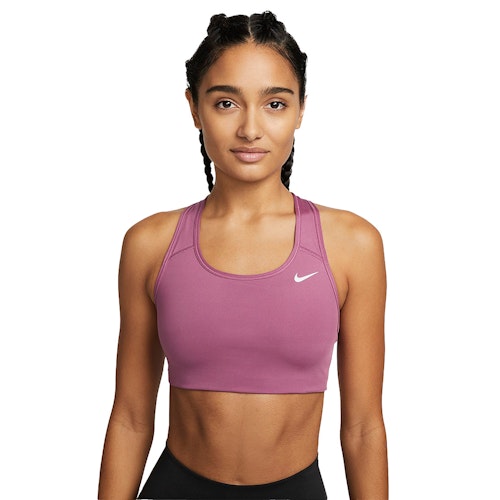 Nike Swoosh BH er en BH, der ikke er polstret. De kompressions- og fugttransporterende materialer fungerer godt sammen og sikrer, at du altid har en behagelig fornemmelse. Dri-FIT-teknologien leder hurtigt transpiration væk fra huden. De glatte sømme føles bløde mod huden og forårsager ikke irritation eller gnidninger. Denne bh er lavet til medium-impact sportsaktiviteter som løb, spinning og fitness.
