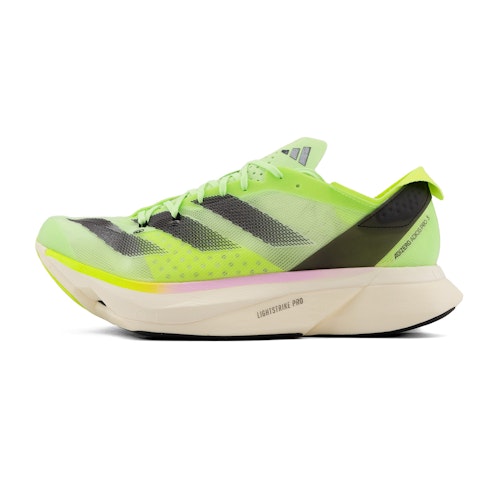 This shoe is equipped with adidas' ultra-light Lightstrike Pro foam. This cushioning material stores more energy than any other cushioning material adidas has developed so far. It then returns almost all the energy, so very little energy is lost. The super light cushioning provides next-level speed. Between the foam material there is a Carbon plate under the heel and EnergyRods that are enriched with carbon under the forefoot. The EnergyRods follow the anatomy of the forefoot. They return a lot of energy and offer flexibility. This means you experience a very energetic and reactive push-off. The Carbon plate in the heel absorbs the impact during a heel landing. Thanks to the geometry of the competition shoe, you experience a powerful transition and transition, allowing you to run faster with less effort.