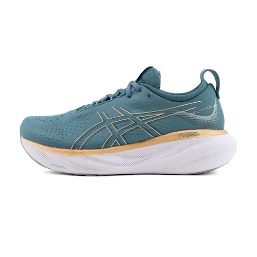 Article number: 1012B356-403 Article group: All-round Running Shoes Collections: ASICS Gel Nimbus Colour: Blue Gender: Women Brand: ASICS Shoe type: Neutral Cushioning: Moderate / maximum Forefoot height: 33,5 mm Heel height: 41,5 mm Offset: 8 mm Responsiveness: Minimum / moderate Support: Average Weight: 250 g Width: Normal