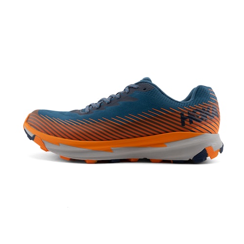 The HOKA Torrent 2 for men is a fast trail running shoe. The Torrent 2 is the second edition of the model and has been designed for tempo trainings on trails. If you are looking for comfortable cushioning during your race, then the Torrent 2 could also be used as a competition shoe. The Engineered Mesh upper feature fibres made of recycled Polyester. This doesn't just benefit the environment, but also has a positive effect on the support of that the upper gives. The overlays on the upper provide protection from sticks and rocks encountered on your runs.