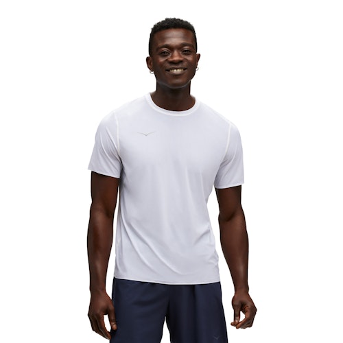 Article number: 1151071-WHT Article group: Short Sleeve Tops Fit: Regular Specifications: Reflective Colour: White Gender: Men Brand: HOKA Material: 72% recycled nylon 28% elastane