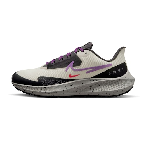 The Nike Air Zoom Pegasus 39 Shield are neutral, all-round running shoes. The 'Pegasus' is the oldest model of running shoes from Nike and also one of the most popular. The Pegasus 39 Shield is the water-resistant version with extra grip on the outsole. The shoes are ideal for your daily run, but can also be used during an endurance run. Its versatility lets you comfortably run at a slower or moderate pace for your recovery runs, but you can also pick up the pace worry-free during your workouts. The upper is inspired by the AeroLoft technology. It retains heat without overheating the feet. On the inside is soft fleece for extra comfort and perfect insulation. The insulated tongue with insert also offers extra protection against weather influences. Finally, your feet stay dry thanks to the special PCV-free treatment and skins in places where water can easily penetrate. The Nike React midsole is a lightweight, strong foam for a smooth, responsive ride. The material absorbs the impact during landing and distributes it over the feet. At the take-off you get that energy back for an energetic feeling. In fact, every type of neutral runner will walk away with the Pegasus 39, whether you are a forefoot, midfoot or heel lander. In the forefoot is a Zoom Air unit. This unit is filled with air that is under a certain pressure and that compresses on landing and rebounds on take-off. This Zoom Air unit is higher and therefore closer to your foot in the Pegasus 39. This gives more responsiveness. This means that you get more energy back from the energy you put into each stride than with average running shoes. This results in a light and active running feeling. The heel is designed to optimize landing for a smooth transition from heel to toe. This is combined with thick foam for a responsive experience. The outsole gives you a lot of grip in rough weather. The texture of the sole is inspired by that of winter tires. The micro-grooves and irregular shapes ensure that water can drain well and you maintain direct contact with the ground.