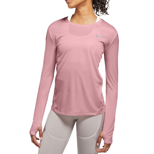 The Nike Miller Shirt for women is a running top with long sleeves. The top features Nike's Dri-FIT technology, which wicks moisture away effectively. It helps to keep you dry during your runs. The mesh-material on the back provides ventilation. The round and extended hem on the back and the thumb holes in the sleeves allow for extra coverage during activities. The loose fit ensures a lot of freedom of movement.