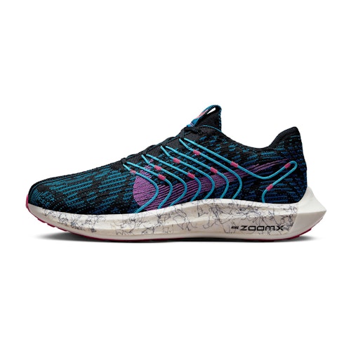 The Pegasus Turbo Next Nature features Flyknit technology with strong fibers for a light upper that offers strength at the same time. Recycled yarn, laces and inner lining make this fast shoe a sustainable choice.