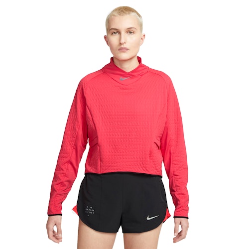 The Nike Therma-Fit Run Division Midlayer for ladies is a running shirt with long sleeves. The Nike Therma-FIT midlayer is an ideal option for before, during or after your activity. The stand-up collar ensures that the neck area stays warm. The heat-regulating material and smooth feel provides comfort with every step. Nike Therma-FIT technology uses your natural body heat to keep you warm when it's cold. The textured knit material feels smooth, comfortable and light. The shirt features side pockets with flap openings to easily store small essentials. The graphic elements stand out with a rainbow-coloured reflection when light shines on them.