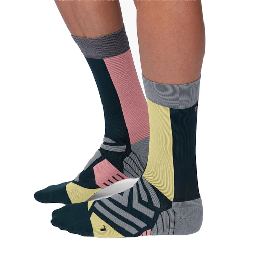 The On High Socks for men are functional running socks that reach half-way up the calf. The minimalist design does exactly what you want from a sock. It keeps your feet cool and dry while you increase tempo. The left and right foot anatomical fit ensures a lot of comfort. The technical material helps you control temperatures of your feet. The reinforcements at the foot arch provides targeted support and ensures that the socks stay in place during your runs. The reinforced fibres at the toes withstand wear. The socks are ideal for running in warm conditions or for during your race.