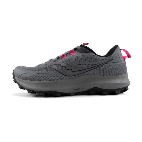 The Saucony Peregrine 13 GTX is a multi-purpose shoe that can be considered a real road-to-trail shoe. This model has the essential features to be functional on both paved and unpaved trails. In addition to good cushioning when walking on roads, the shoe also offers good grip on uneven surfaces. Adventure awaits with this trail shoe, ready to accompany you on rough surfaces! MidsoleThe PWRRUN cushioning material provides good cushioning and energy return and a super comfortable feeling under the foot. By incorporating a protection plate in the midsole, the shoe can withstand sharp obstacles and helps you make agile movements during your trail run. In addition, the Peregrine GTX offers extra comfort with the PWRRUN+ sockliner, which adds an extra layer of cushioning. UpperThe upper of the Peregrine GTX is made with FORMFIT technology, which allows the upper to work together with the footbed and the walls of the midsole. In this way, the foot sinks into the running shoe, as it were, which gives a good lockdown feeling and the necessary stability. The mesh upper ensures that the shoe is very breathable. Sweat vapor will have the chance to escape, but the shoe is protected from rain by the Gore-Tex® upper. OutsoleDefy debris and grit with the updated tread pattern and experience maximum traction and grip thanks to the PWRTRAC rubber. The 3-piece PWRTRAC outsole offers unprecedented traction on uneven surfaces and more flexibility for a smoother stride. Hit the road with the Saucony Peregrine 13 GTX and discover new trail routes!