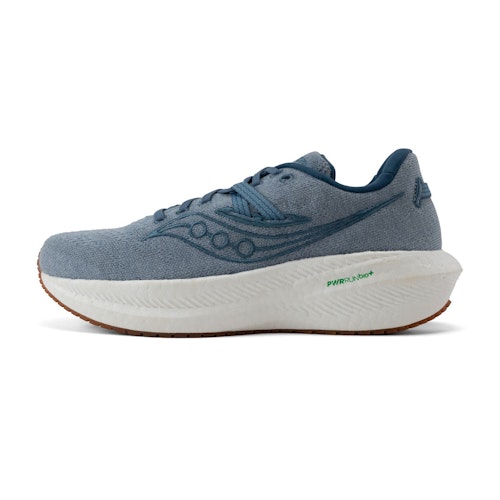 This upper is partially made from recycled materials, demonstrating Saucony's commitment to sustainability. To improve the sustainability of its products, Saucony also uses vegetable dyes in addition to recycled materials to color the upper of the Triumph RFG.