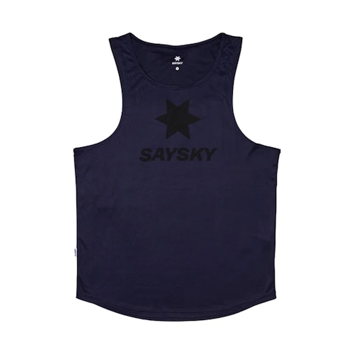 The Logo Flow Singlet is a comfortable sleeveless shirt. The singlet feels soft against the skin and has a black SAYSKY logo on the front and a white woven SAYSKY label on the back.