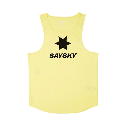 The Logo Flow Singlet is a comfortable sleeveless shirt. The singlet feels soft against the skin and has a black SAYSKY logo on the front and a white woven SAYSKY label on the back.
